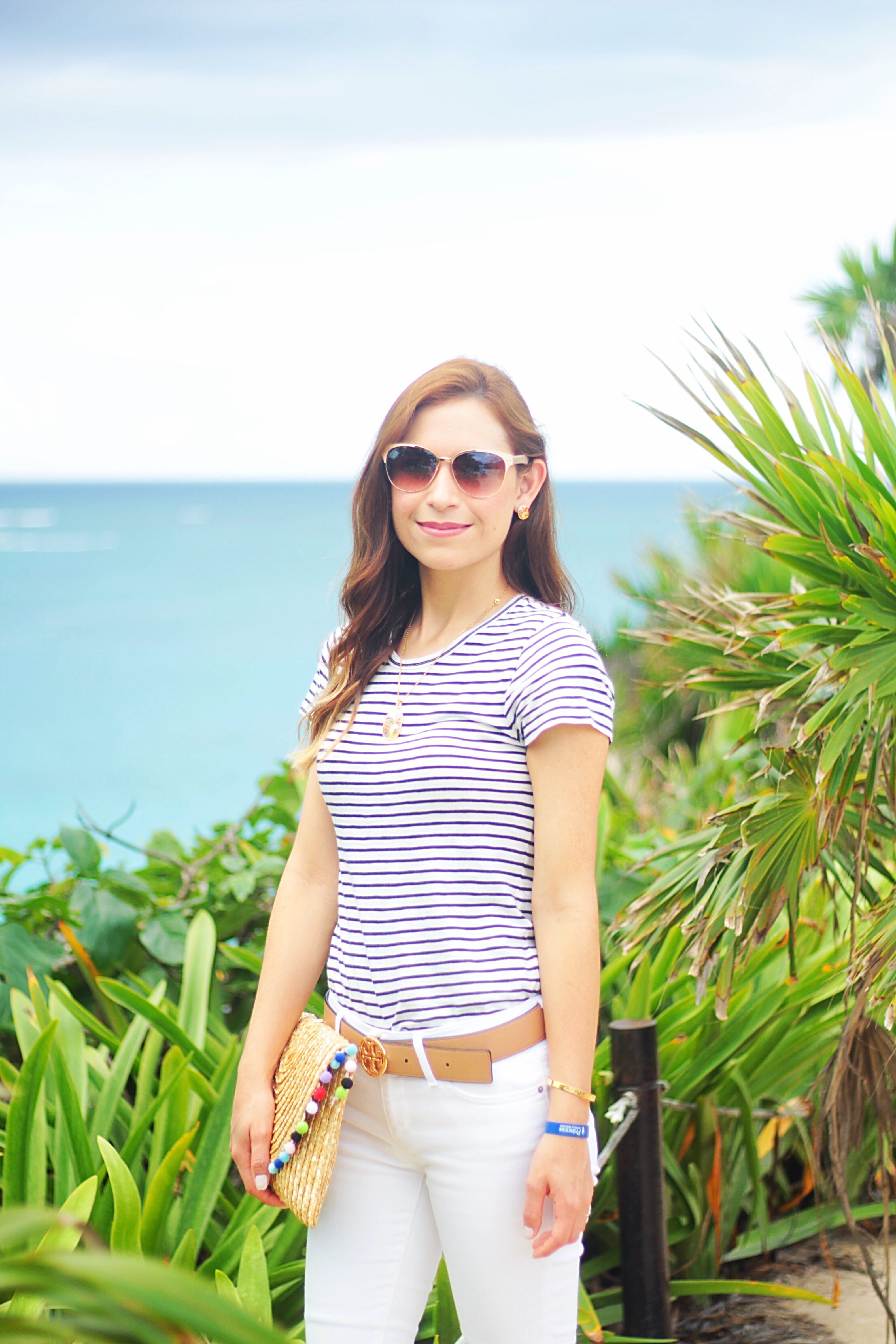 Tee: JCrew, white jeans: Levi’s, Pom pom bag: Express, Sandals, Steve Madden, Belt: Tory Burch, Sunglasses: Nanette Lepore